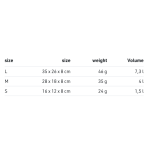 Suurused: S (16x12x8 cm, 1,5L), M (28x18x8 cm, 4L), L (35x26x8 cm, 7,3L).